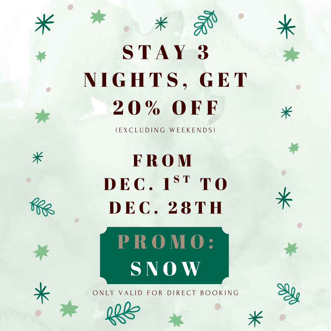 BOOK NOW BOOK DIRECT FOR THE BEST RATES & PACKAGES STAY 3 NIGHTS, GET 20% OFFUSE CODE : SNOW Promo codes book early specialUSE CODE: berl Midweek package | 5th night freeUSE CODE: mdwk CLICK HERE TO RESERVE please note: Only one (1) parking space per room we do not accept pets We do not have an elevator We do not have balconies Facebook-f Instagram Twitter Tripadvisor Envelope sign up & receive special offers